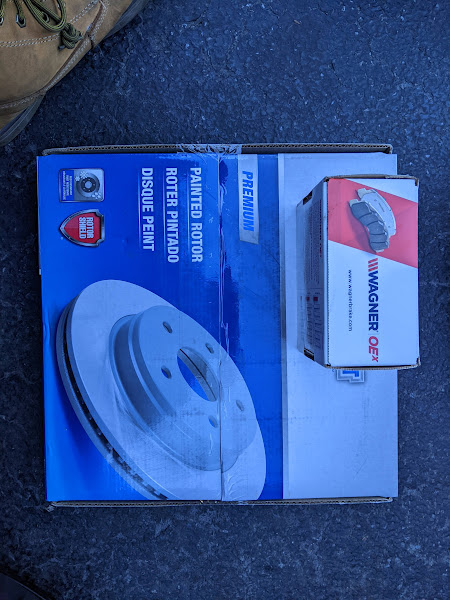 年初做個煞車清潔,潤滑前 brake pins。但近期踩煞車時總感覺後輪傳出登登登聲響,搞得我心情很不美,直覺是後煞車片該換了,同時猜測後煞車盤可能磨損不均,趁advance auto之前有25%折扣就已經先將備料好了,所以今日掃完落葉之後先拆駕駛側的後輪檢視,果然就是後煞車片年限將近而且後煞車盤內側生鏽,就先換這一側。